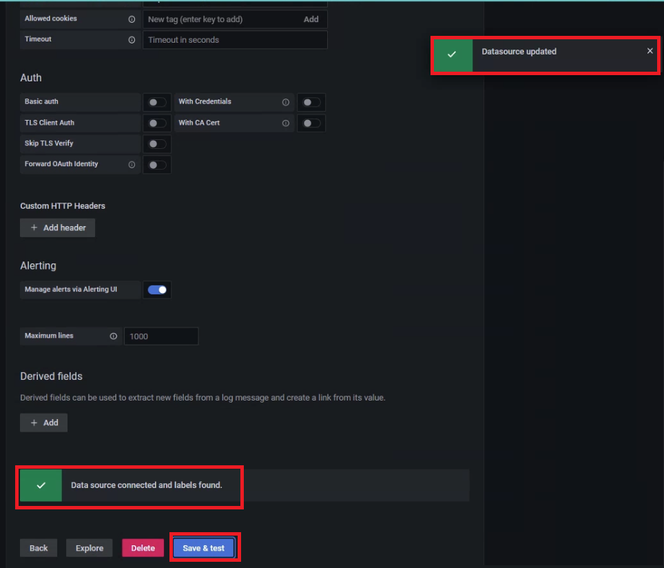 우측 상단에 'Datasource updated' 라는 성공 메세지가 뜨는 동시에
