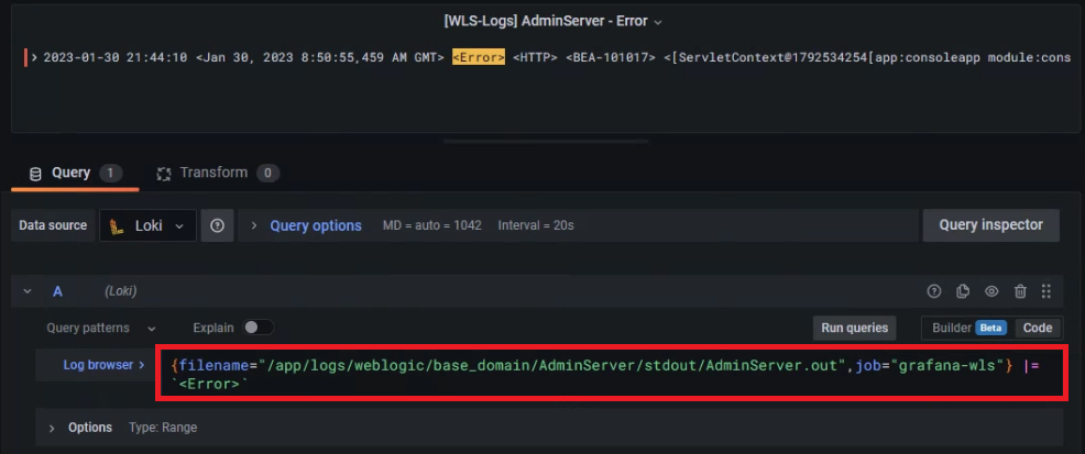 {filename="/app/logs/weblogic/base_domain/AdminServer/stdout/AdminServer.out",job="grafana-wls"} |= `<Error>`
