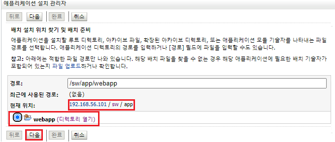 (2-2) 현재 위치를 ‘192.168.56.101/sw/app’로 설정하고 webapp 체크 후 [다음] 클릭