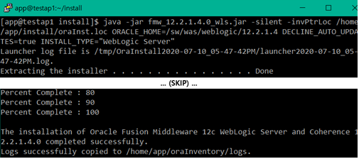 -invPtrLoc /home/app/install/oraInst.loc \ ORACLE_HOME=/sw/was/weblogic/12.2.1.4 \ DECLINE_AUTO_UPDATES=true \ INSTALL_TYPE=”WebLogic Server” |