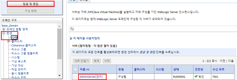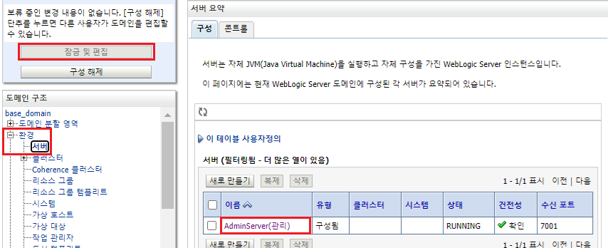 (6-1) Admin Console 접속 후 [잠금 및 편집] – [환경] – [서버] – [AdminServer(관리)] 클릭