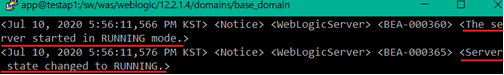 USER_NAME=app SERVER_NAME=AdminServer SERVER_PORT=7001 DOMAIN_HOME=/sw/was/weblogic/12.2.1.4/domains/base_domain LOG_DIR=${DOMAIN_HOME}/logs # Check User Name IAM=`id -un` # Check Startup User Check if [ $USER_NAME != $IAM ] ; then echo "Error : This user is \"$IAM\". Please login as a \"$USER_NAME\" user." exit fi # Check Process Check PID=`ps -ef | grep java | grep ${SERVER_NAME} | grep ${SERVER_PORT} | awk '{print $2}'` if [ "$PID" != "" ] ; then echo "ERROR : \"${SERVER_NAME}\" server is already running!!" exit fi USER_MEM_ARGS="-D${SERVER_NAME} -D${SERVER_PORT} -Xms512m -Xmx512m" USER_MEM_ARGS="${USER_MEM_ARGS} -Djava.security.egd=file:///dev/urandom" USER_MEM_ARGS="${USER_MEM_ARGS} -Dweblogic.system.BootIdentityFile=./boot.properties" export USER_MEM_ARGS mv ${LOG_DIR}/${SERVER_NAME}.out ${LOG_DIR}/${SERVER_NAME}.`date +'%y%m%d_%H%M%S'` nohup ./startWebLogic.sh > ${LOG_DIR}/${SERVER_NAME}.out 2>&1 & sleep 1 tail -f ${LOG_DIR}/${SERVER_NAME}.out EOF |