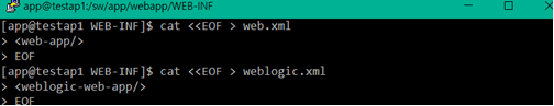 <web-app/> EOF cmd> cat <<EOF > weblogic.xml <weblogic-web-app/> EOF |