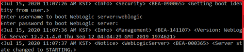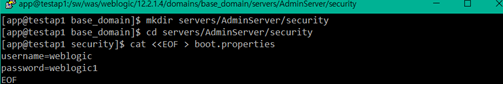 cmd> mkdir -p servers/AdminServer/security cmd> cat <<EOF > servers/AdminServer/security/boot.properties username=weblogic password=weblogic1 EOF |