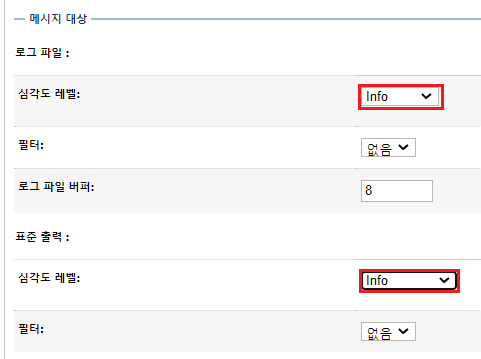 (6-3) 로그 파일, 표준 출력 부분의 심각도 레벨을 ‘Info’로 변경 후 저장