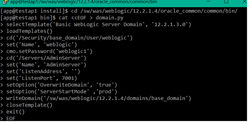 cmd> cat <<EOF > domain.py selectTemplate('Basic WebLogic Server Domain', '12.2.1.3.0') loadTemplates() cd('/Security/base_domain/User/weblogic') set('Name', 'weblogic') cmo.setPassword('weblogic1') cd('/Servers/AdminServer') set('Name', 'AdminServer') set('ListenAddress', '') set('ListenPort', 7001) setOption('OverwriteDomain', 'true') setOption('ServerStartMode' ,'prod') writeDomain('/sw/was/weblogic/12.2.1.4/domains/base_domain') closeTemplate() exit() EOF cmd> ./wlst.sh ./domain.py |