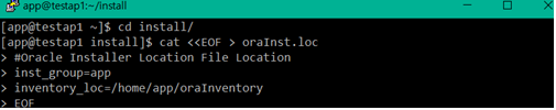 cmd> cat <<EOF > oraInst.loc inst_group=app inventory_loc=/home/app/oraInventory EOF |