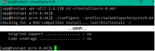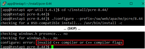 cmd> ./configure --prefix=/sw/web/apache/pcre-8.44 configure: error: Invalid C++ compiler or C++ compiler flags # 에러 발생 cmd> sudo yum -y install gcc-c++ cmd> ./configure --prefix=/sw/web/apache/pcre-8.44 cmd> make cmd> make install |