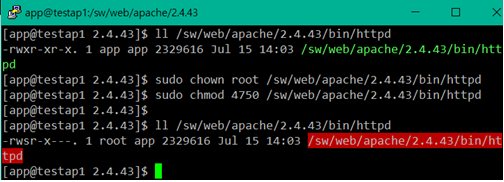 cmd> sudo chown root httpd cmd> sudo chmod 4750 httpd |