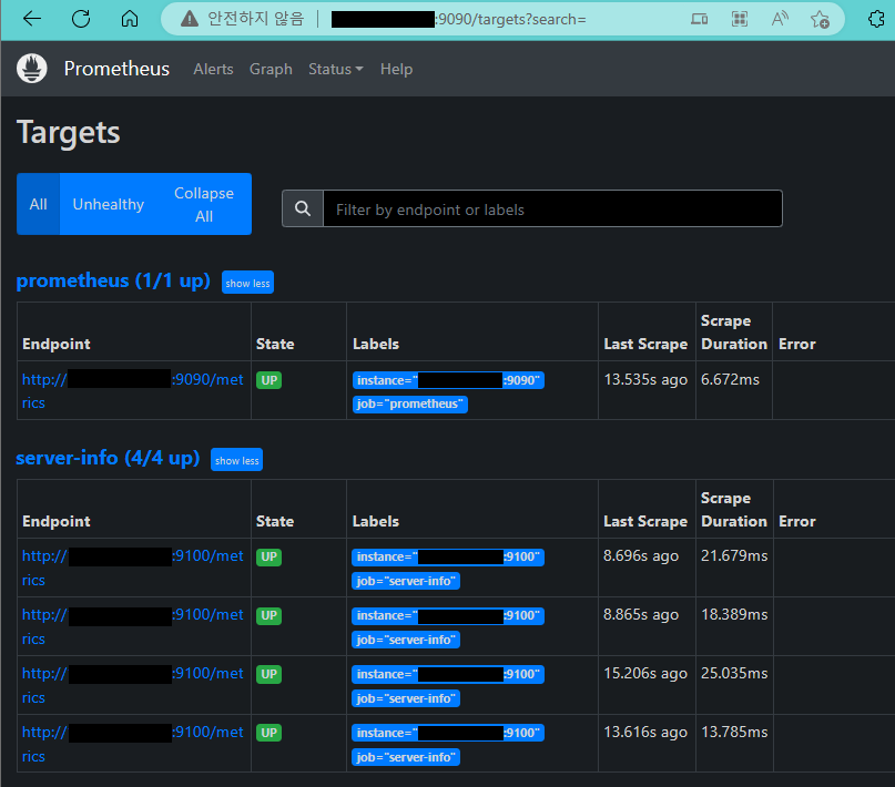실행 확인 후 로컬 브라우저를 통해 http://192.168.56.112:9090/targets 에 접속 성공 확인