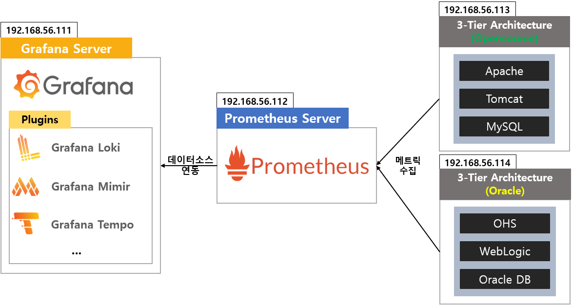 이 문서는 Grafana 및 Prometheus의 설치 및 3-티어 아키텍쳐(WEB, WAS, DB) 서버 모니터링을 위한 간략한 연동 가이드를 제공합니다.